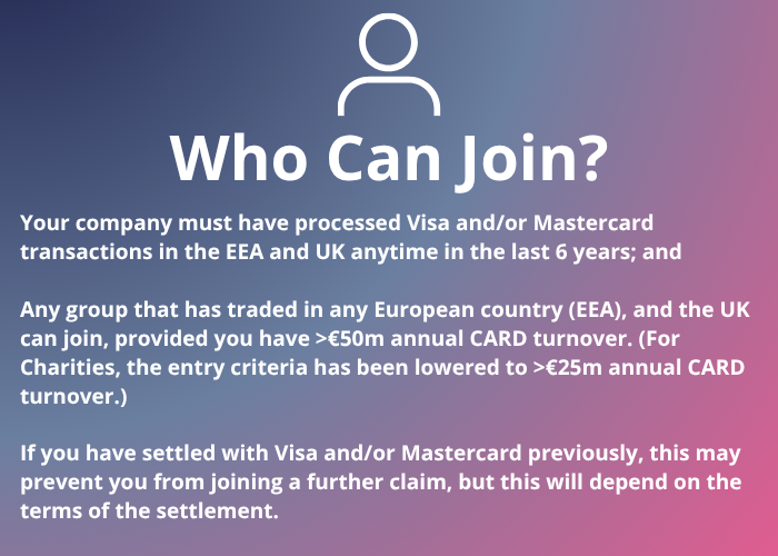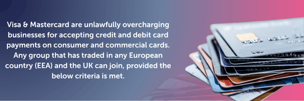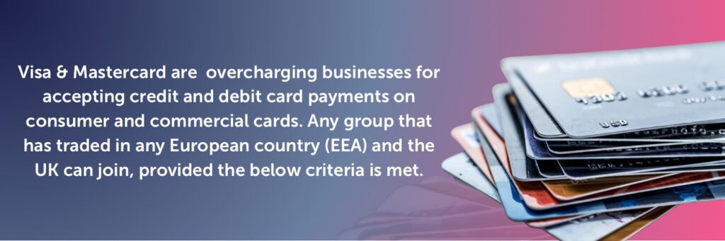 - The claims are for damages on behalf of businesses and organisations trading in the EEA and UK that have accepted Visa & Mastercard credit and debit cards.