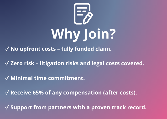 The solicitors acting for the claimants, Hausfeld & Co LLP, will enter into a litigation funding agreement with Bench Walk Advisors, a professional litigation funder, who will pay all the costs of the litigation while it is ongoing. There will consequently be no fees to be paid by claimants while the litigation is underway.